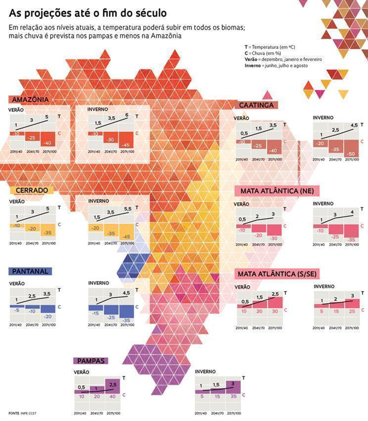 Imagem: Projeções climáticas até 2100. Fonte: Revista Fapesp.